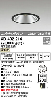 メーカー: ODELIC/オーデリック 【ランプ付】 光色:電球色3000K M形一般形 光角:15° 埋込穴:125mm 巾:135mm 埋込必要高:200mm アルミダイカスト(鏡面) 重量:0.7kg 断熱施工不可 ※調光器・調光信号線別売 【対応電源・調光器】 C1950 CDM-T35W相当 定格消費電力22W 皮相電力(100V/200V/242V) 23VA/23VA/23VA 非調光:XA432001F PWM調光:XA432001P 【調光信号線】 OA076091 【対応調光器】 LC1422(100V)・LC301(100V)・LC302(200V)・LC603(100V)・LC615(100V) 取付可能天井高厚5〜25mm ※取付工事が必要です。