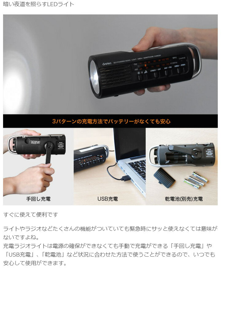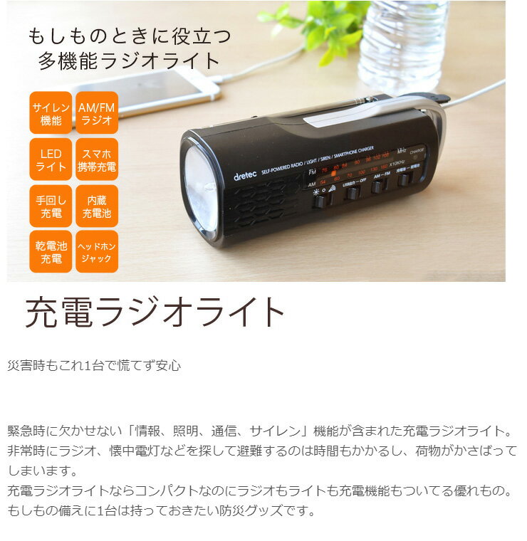 ドリテック さすだけ充電ラジオライト PR-321 ホワイト ブラック 防災ラジオ 手回し充電 多機能 LEDライト 懐中電灯 USB充電【送料無料】