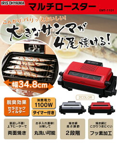 【在庫限り】 【あす楽】マルチロースター アイリスオーヤマ EMT-1101-R EMT-1101-S送料無料 フィッシュロースター 魚焼き器 魚焼きグリル 電気 両面焼き ワイドグリル さんま 焼き鳥 洗える フッ素 脱臭 ガラス窓 タイマー付き レッド シルバー ロースタ