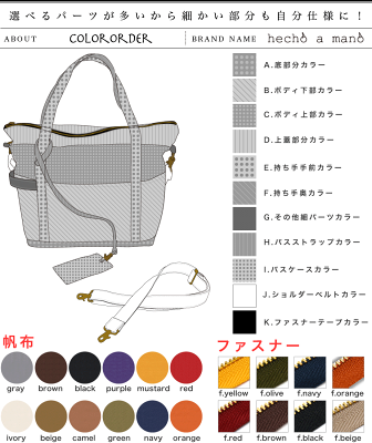 ) カラーバリエーション カラーオーダー(10のパーツを12色の生地から、1つのパーツを8色のファスナーから組み合わせてお選び頂けます) 素材 10号帆布(パラフィン加工) 生産国 日本 モニター 出来るだけ実物の色味に近づくように画像処理させていただいておりますが、お使いのモニターによっては商品の色味に違いが生じます。